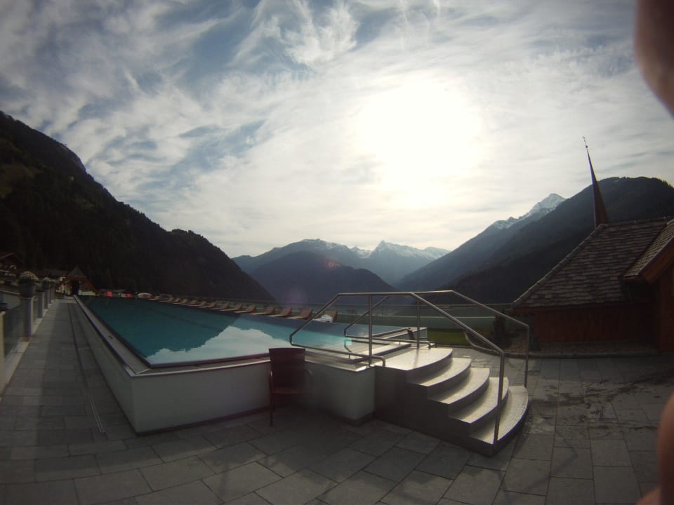 25m Pool mit Ausblick auf Mayrhofen hinunter.