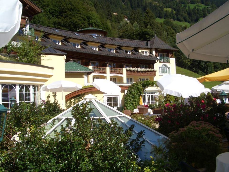 Blick von Frühstücksterrasse auf Hotelflügel