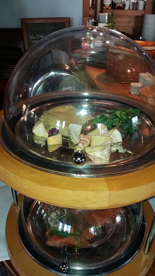 Frühstücksbuffet Käseauswahl oben unten Lachs mit Sauße.