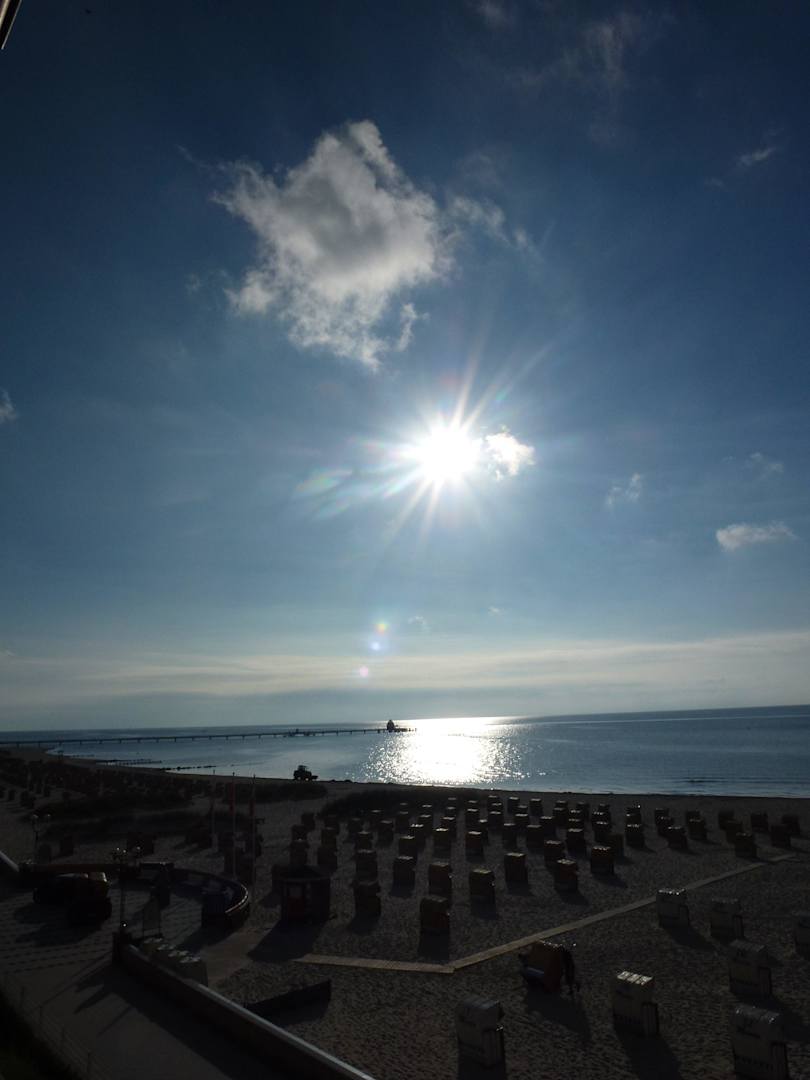 Vom Zimmerbalkon aus um 08:21 Uhr: Strandkörbe und Seebrücke (398 m) im Gegenlicht