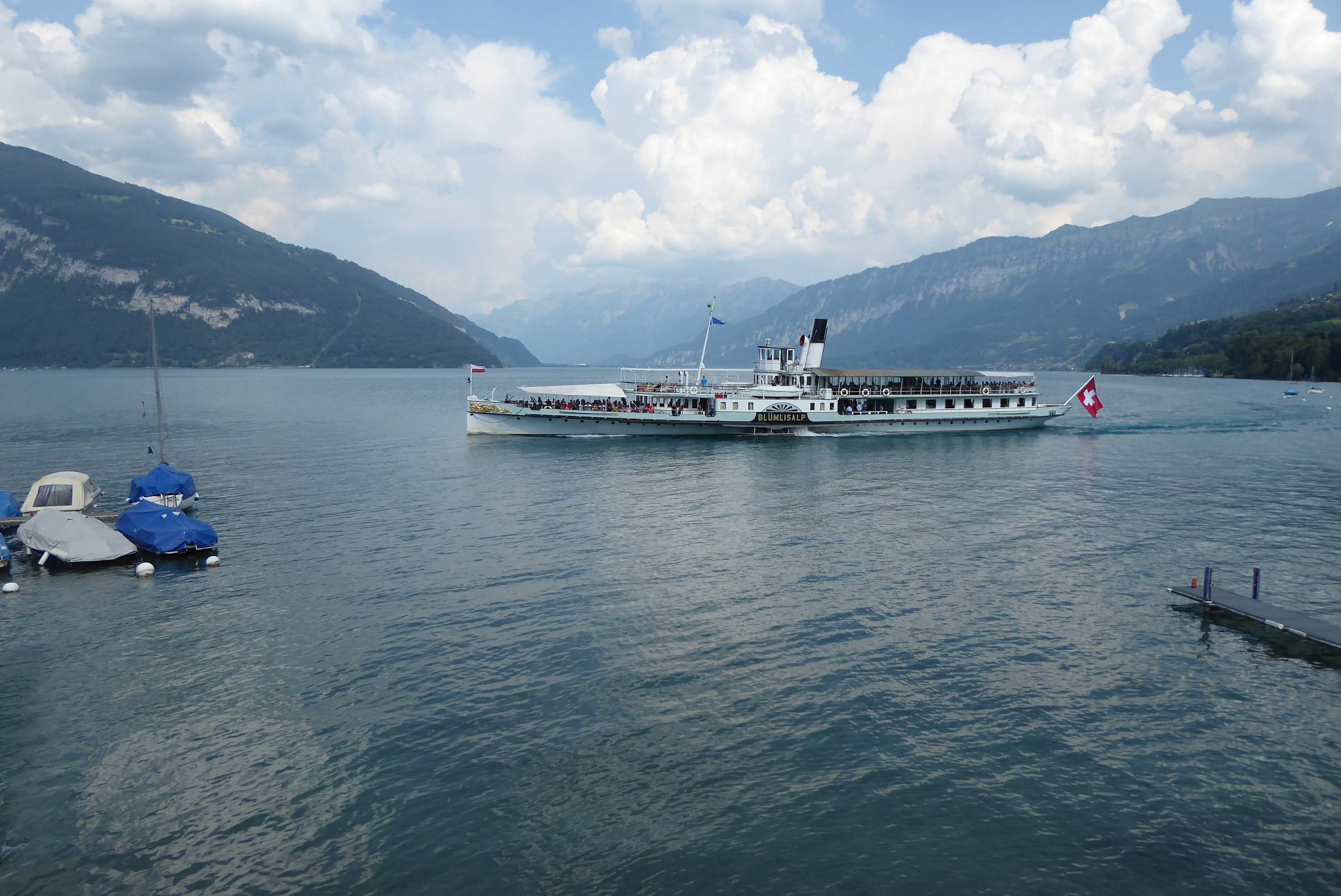 Stündliche Vorbeifahrt vom/zum Anleger Faulensee Richtung Interlaken/ Thun