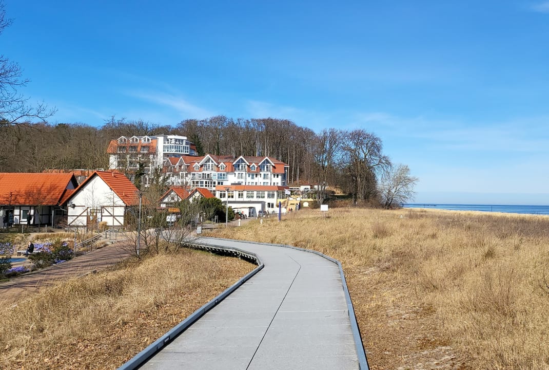 Blick auf das Hotel vom Spazierweg gleich hinter den Dünen.