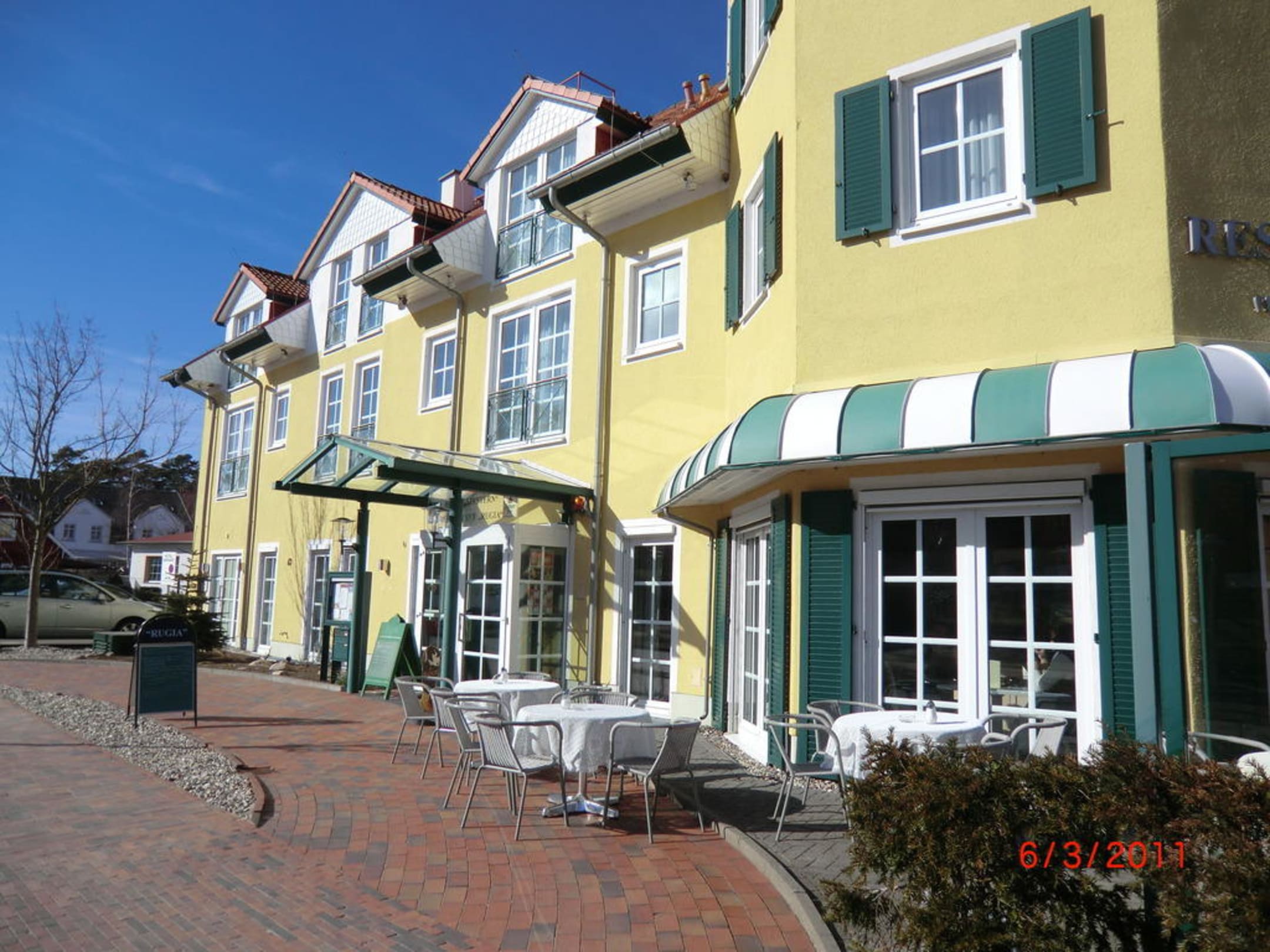 Außenbereich Strandstrasse, Eingang Hotel und Restaurant.