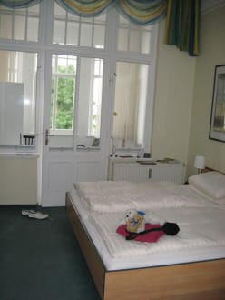 Der Schlafraum ist geräumig, zur Toilette /Dusche geht es direkt vom Zimmer ab.