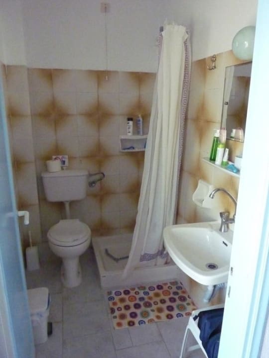 Negative Punkte: keinerlei Ablageflächen, kein Fön, Duschvorhang unten schimmelig, Dusche an sich sehr schmal so dass der Vorhang am Körper kleben bleibt, Abflussloch in der Mitte schäumt über beim Duschen.