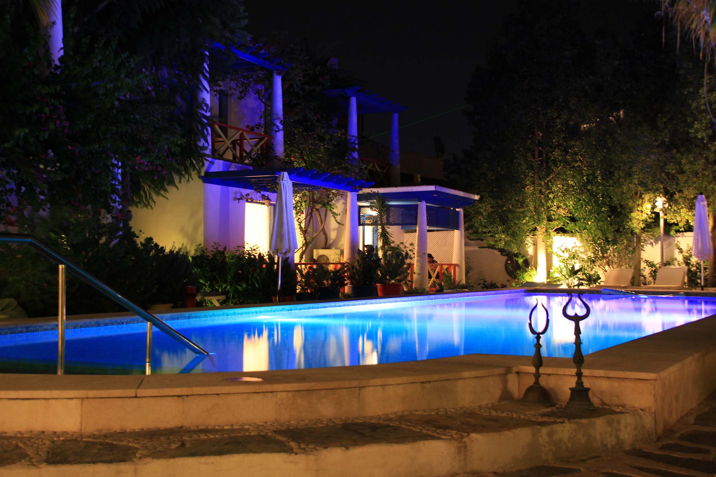 Der Pool ist am Abend stimmungsvoll beleuchte