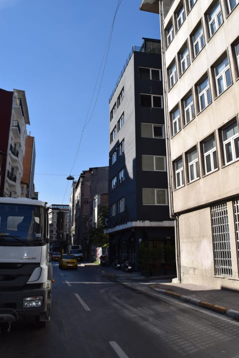Straße vor dem Hotel. Das Hotel ist das graue Gebäude auf der rechten Seite.