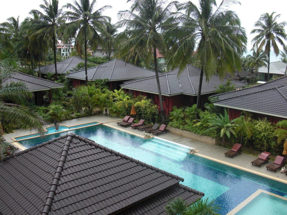 Aussicht vom Zimmer auf den Pool und den Bungalows