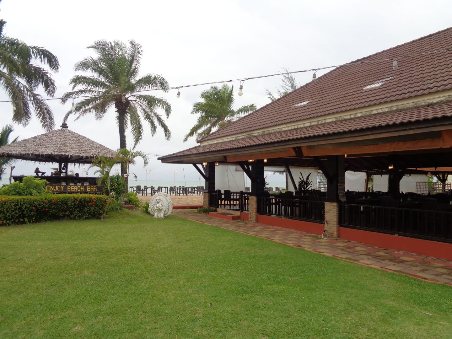 Vorne links die Poolbar, rechts das Open-Air Restaurant und der überdachte Frühstücksbereich