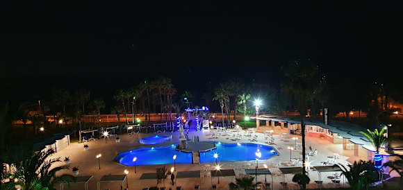 Poolansicht vom Balkon bei Nacht