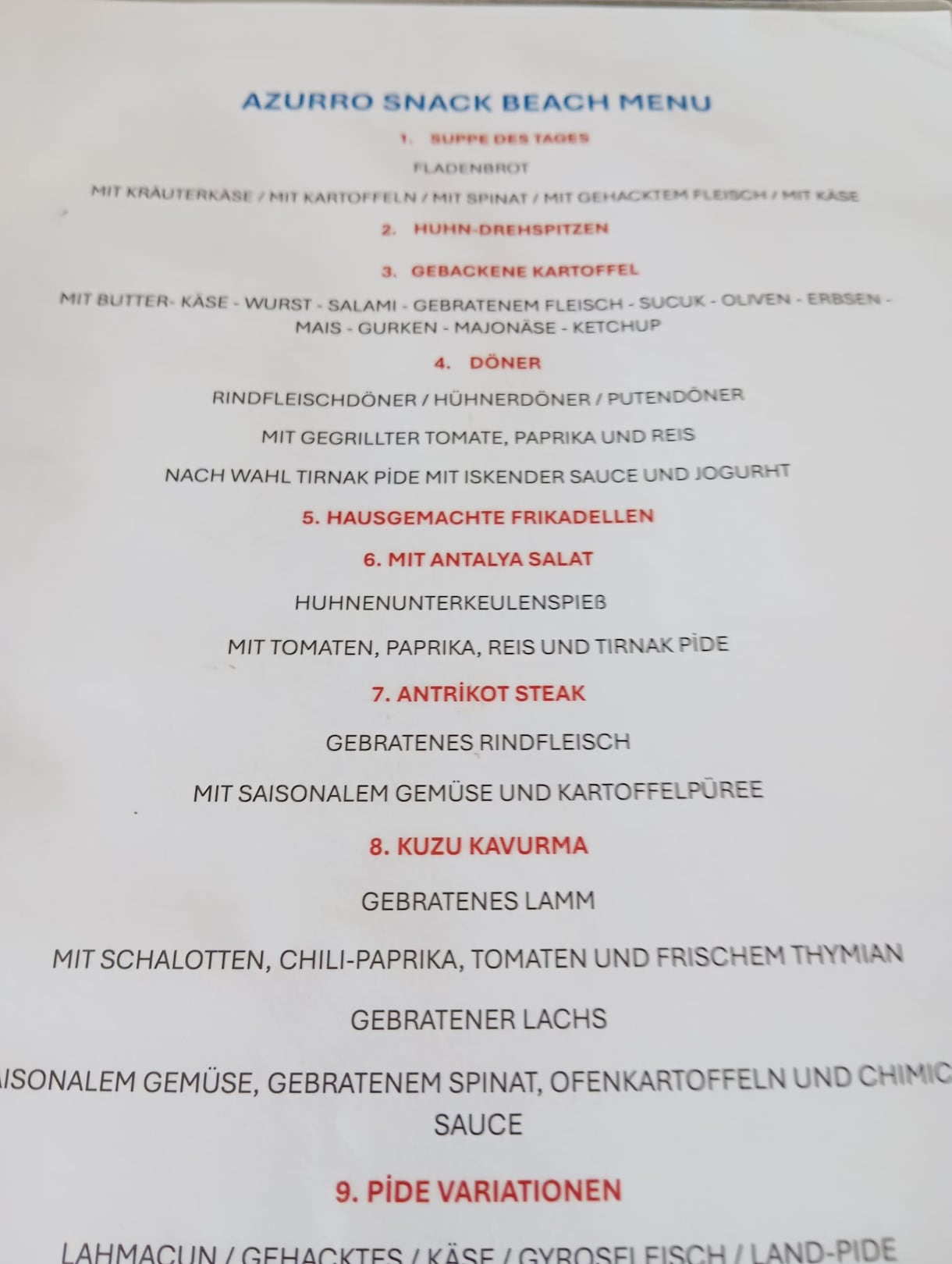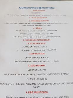 A La Carte Karte der Beach Bar (alles frisch vor Ort zubereitet)