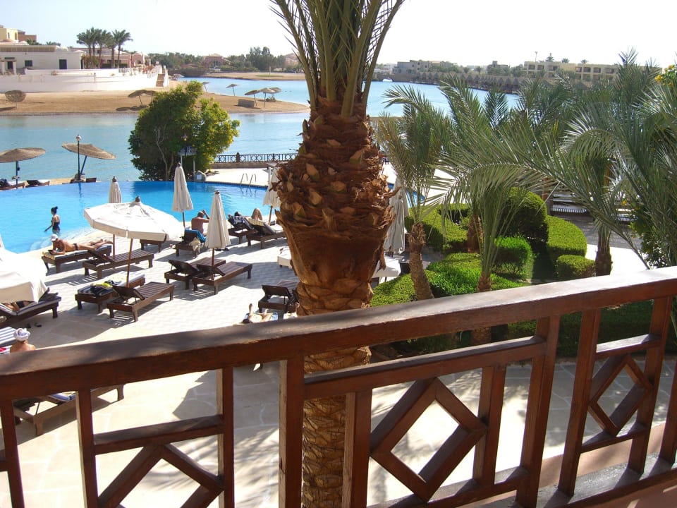 Blick vom Balkon auf Pool und Lagune