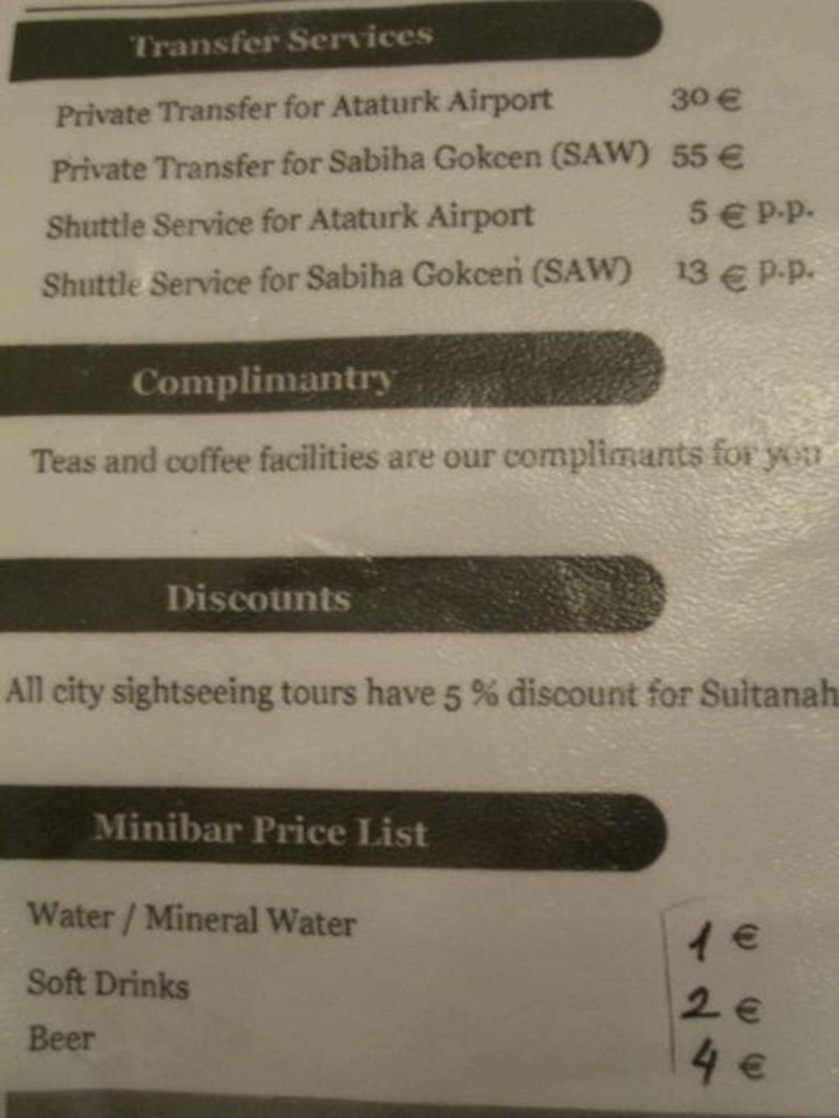 Preise Minibar und Flughafentransfer