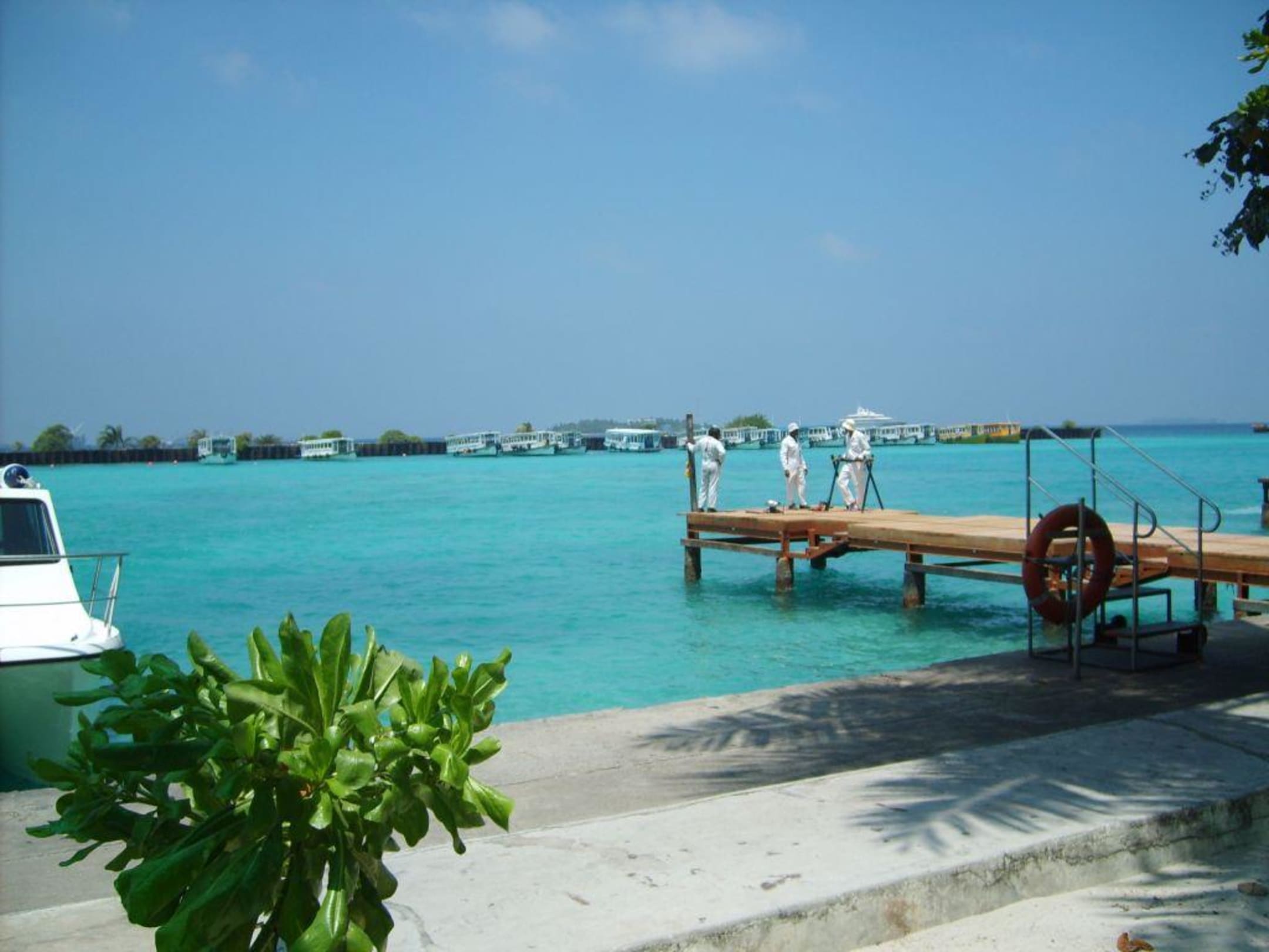 Wir warten auf das Zubringerboot. Das Wasser ist hier schon ein Traum !