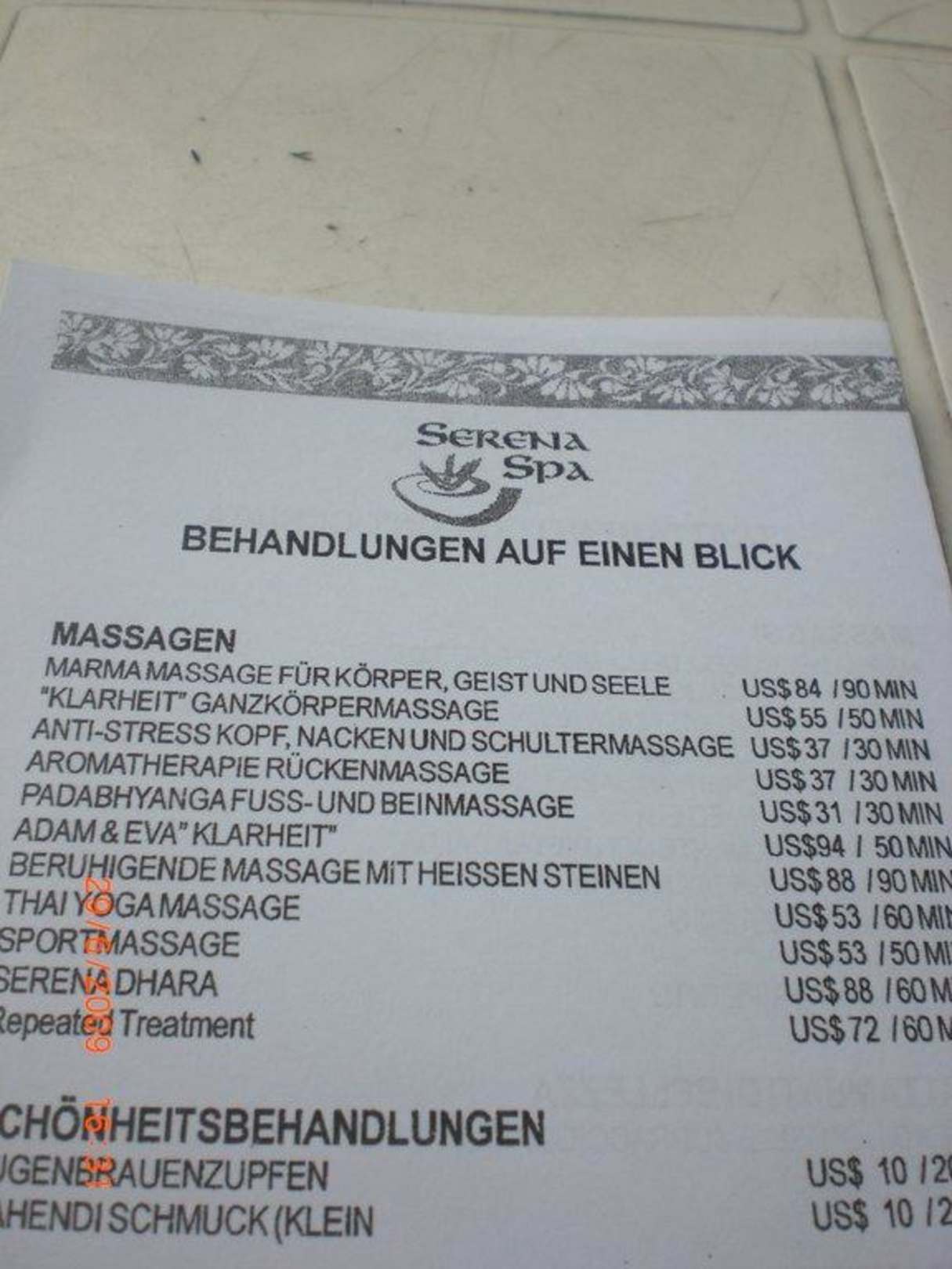 Preisliste für den SPA-Bereich