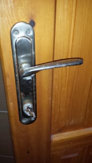 Die Badezimmertür mit Kalk- und Rostresten