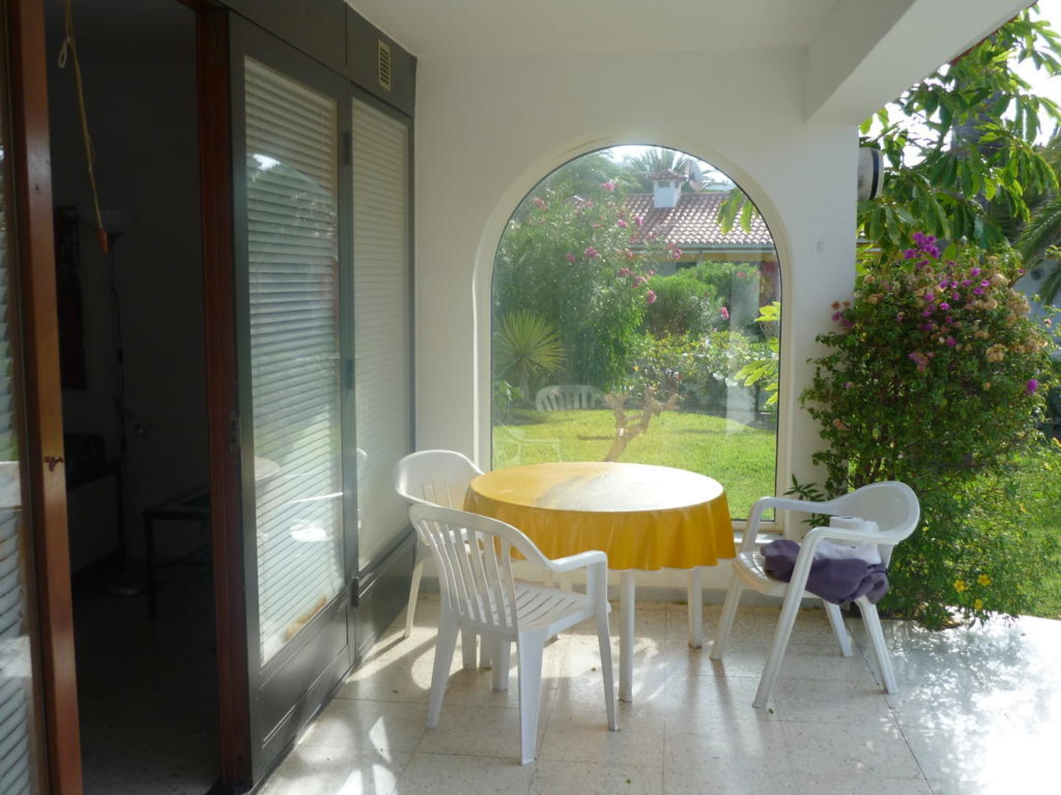 Zwei Plastikstühle und ein Plastiktisch stellen die Terrassenmöbel dar.