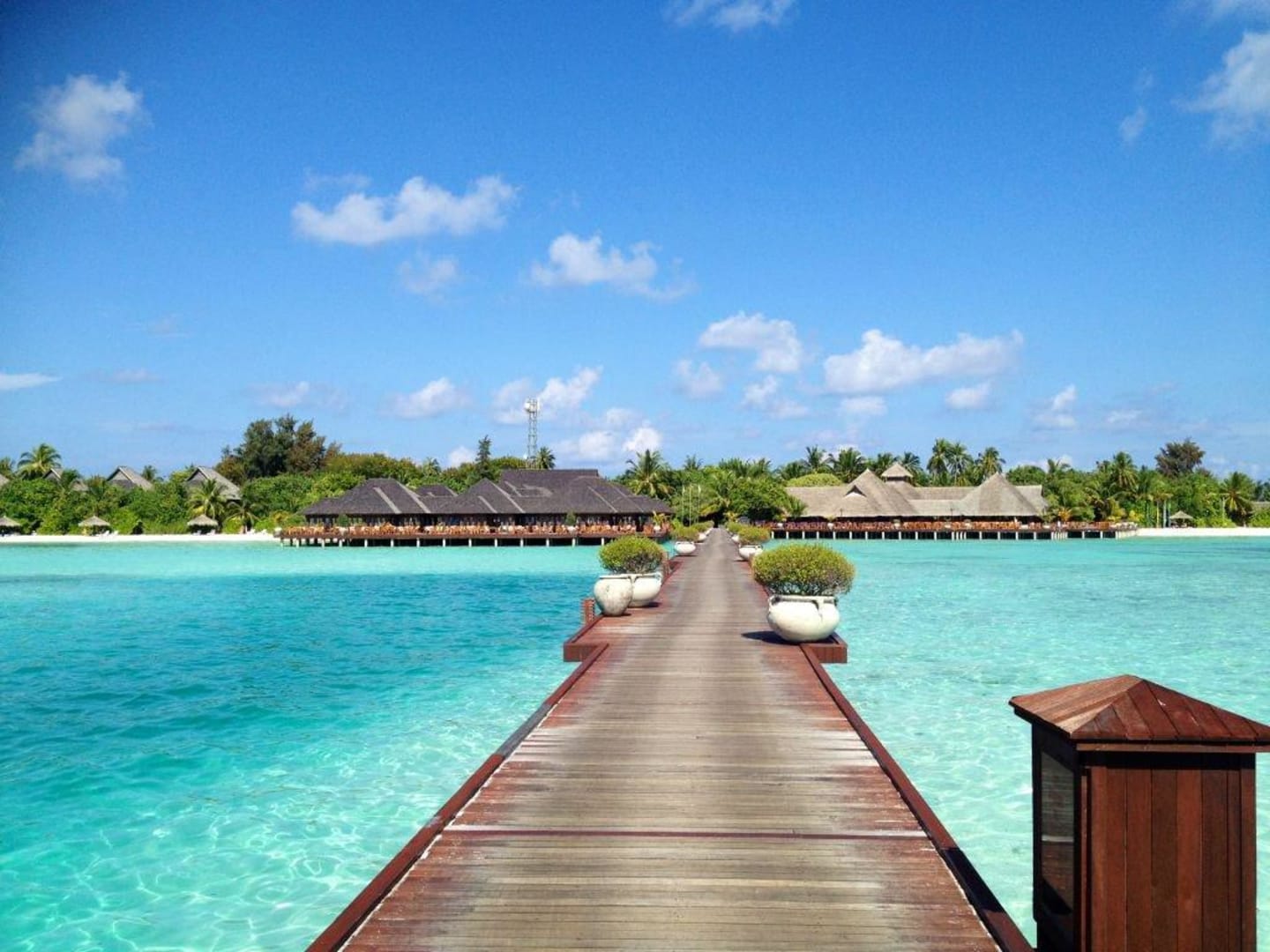 Hotel Olhuveli Beach & Spa ResortAusblick vom Steg auf das Restaurant und die Lagoonbar