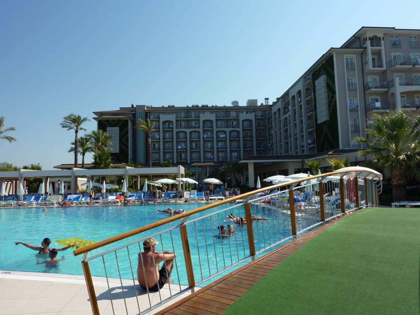 Hotel HaupttraktBlick von der Poolbar über den Ruhepool zum Hauptgebäude.