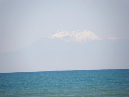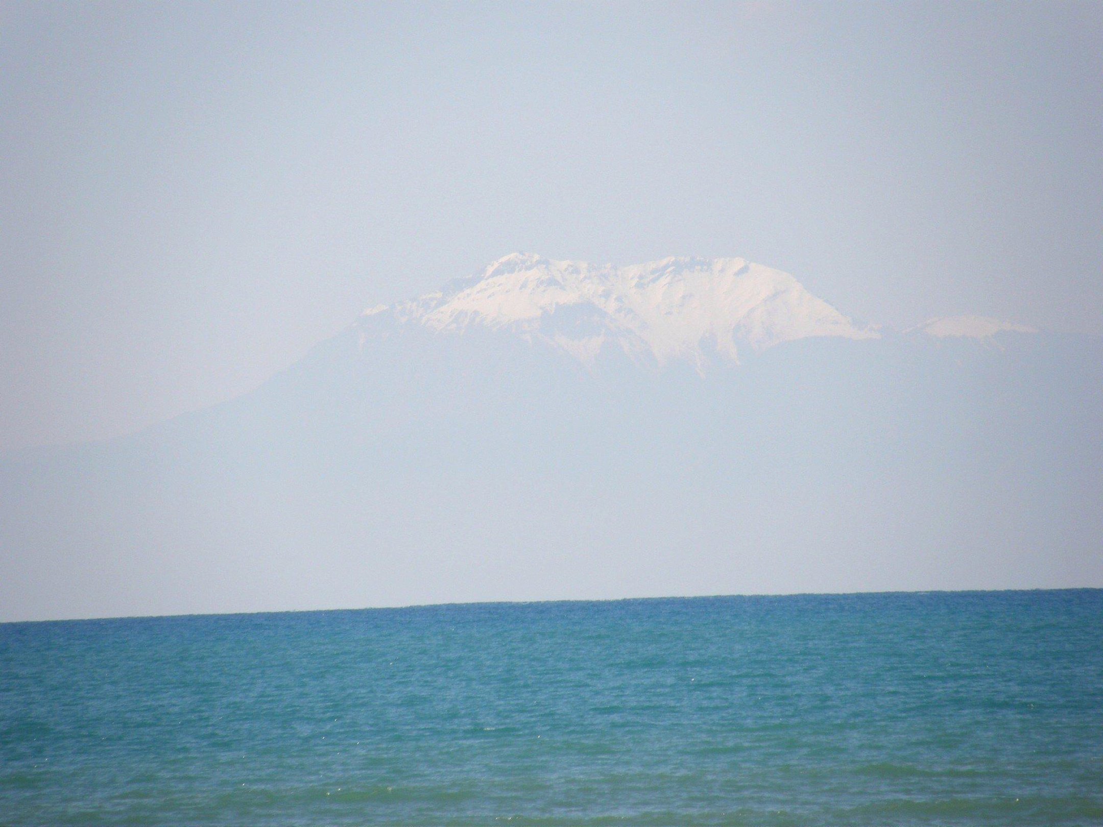 Schneebedeckter Berg am Horizont des Meeres