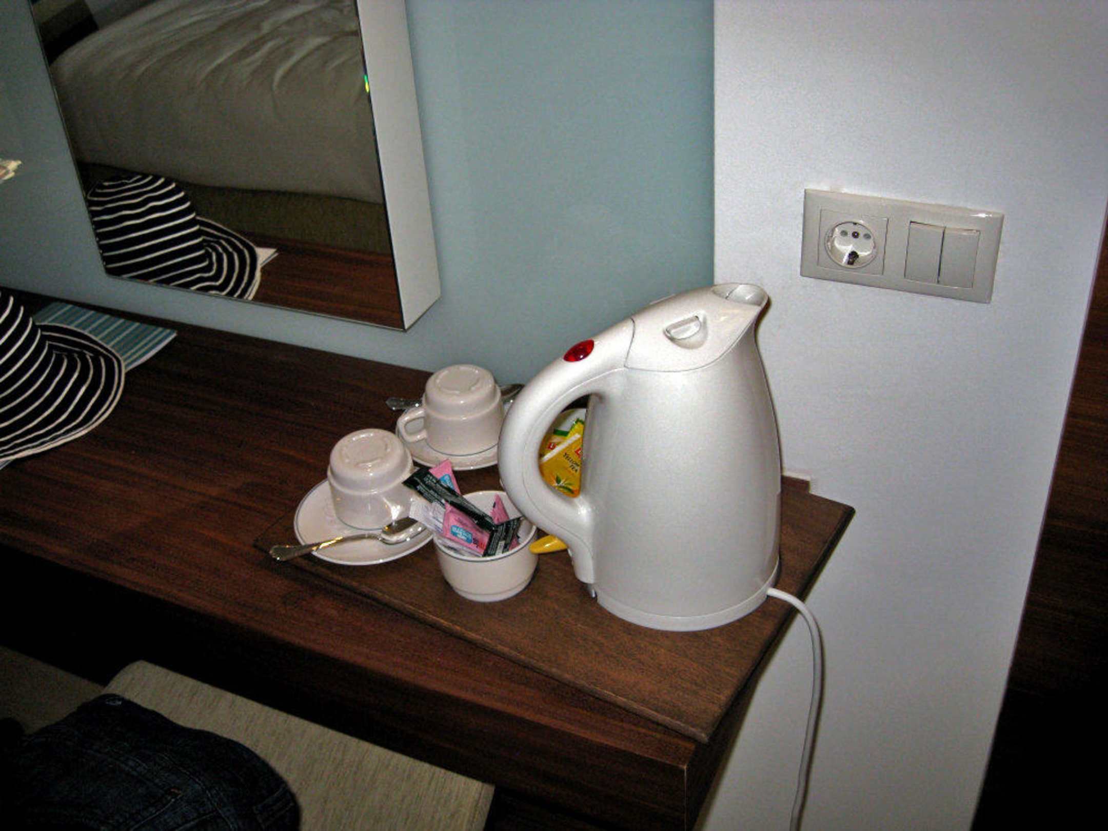Ein Wasserkocher, Tee und Kaffee gehören zur Grundausstattung jedes Zimmers