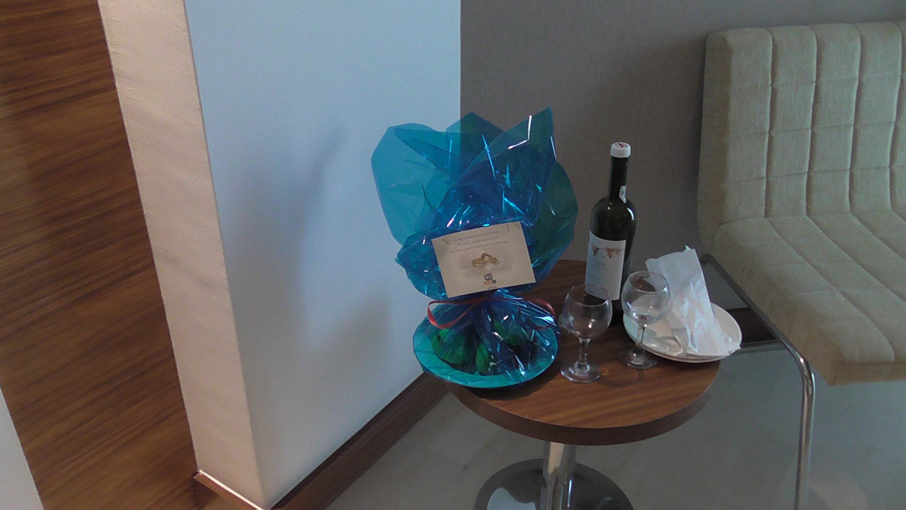 Obstkorb und eine Flasche Wein auf den Zimmer