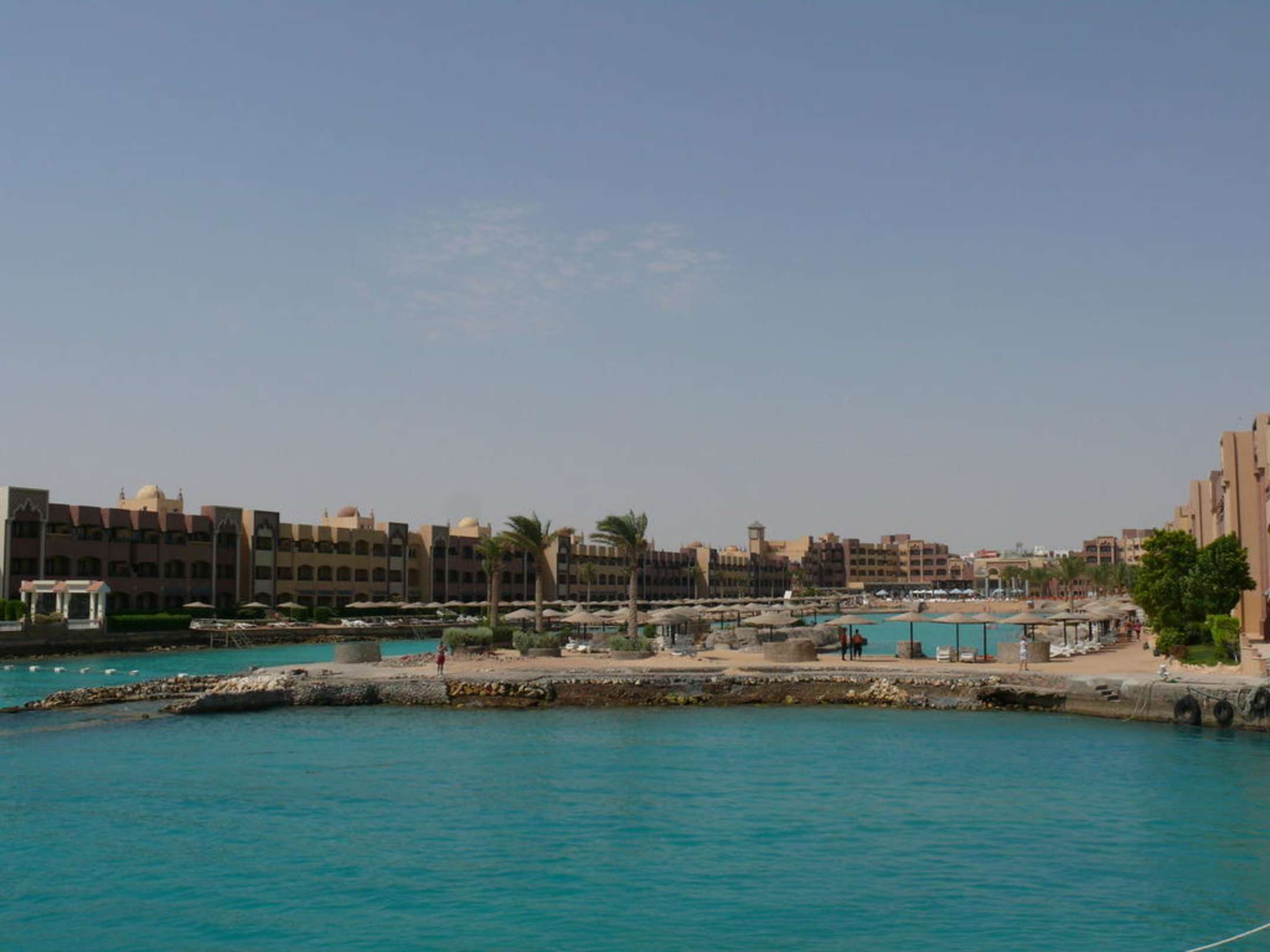 Zdjęcie zrobione z jachtu - prezentuje cały hotel od strony morza.