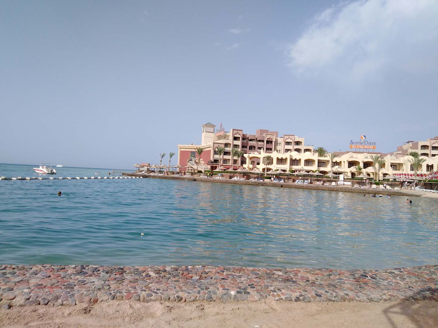 Blick vom strand auf das nachbathotel und die andere seite der bucht