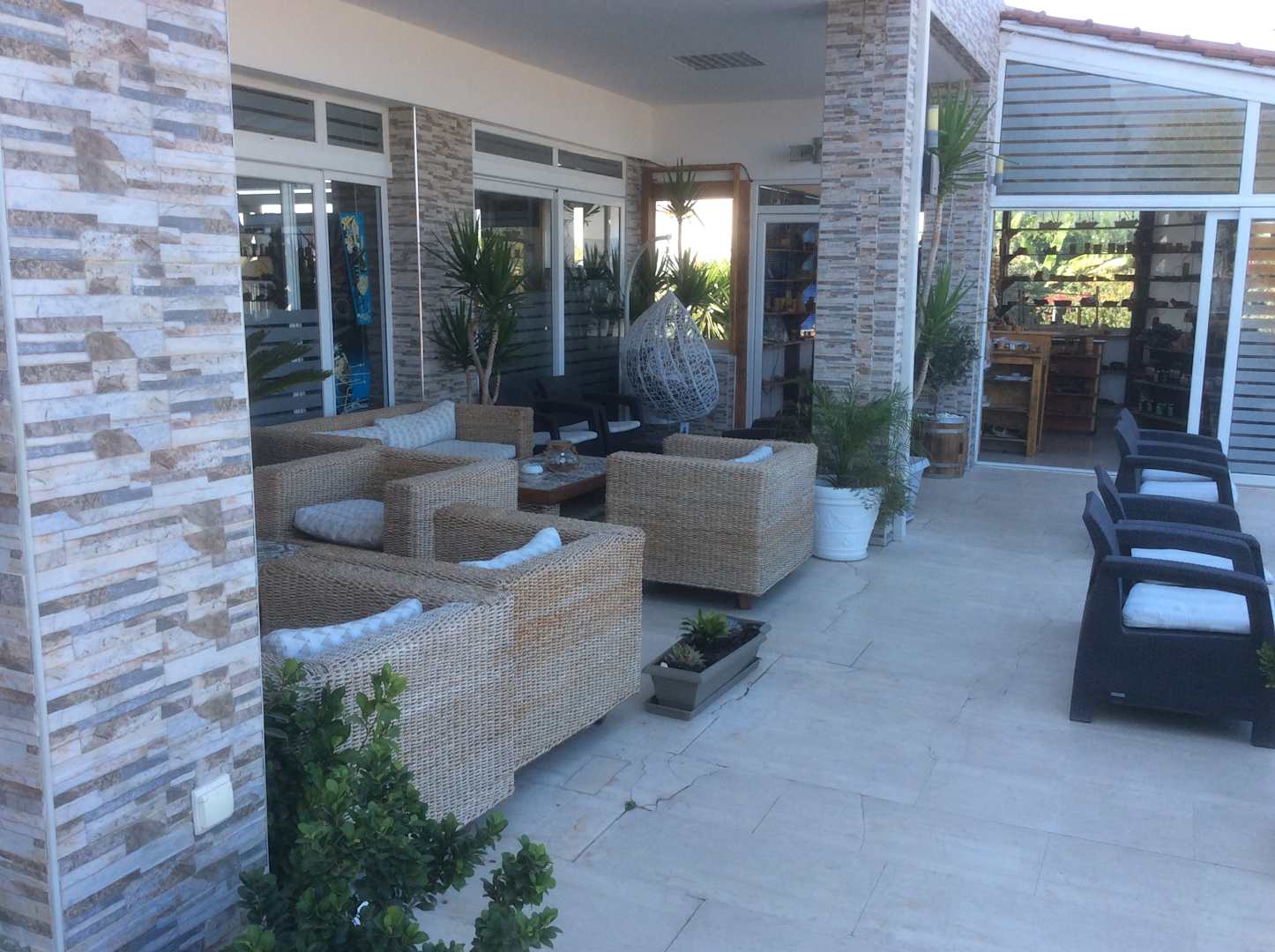 Sitzgelegenheiten vor dem Eingang .Tagsüber zum Kaffee oder Abends zum Cocktail