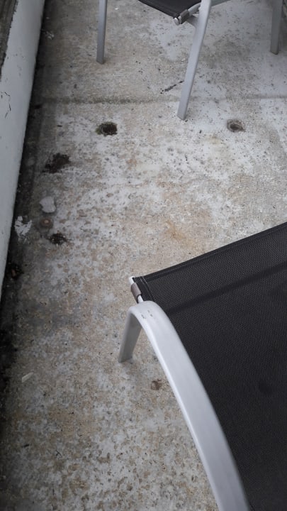 Unser Balkon: 2 Stühle für 3 Personen, kein Tisch. Dafür ein zerbröckelter Betonboden.