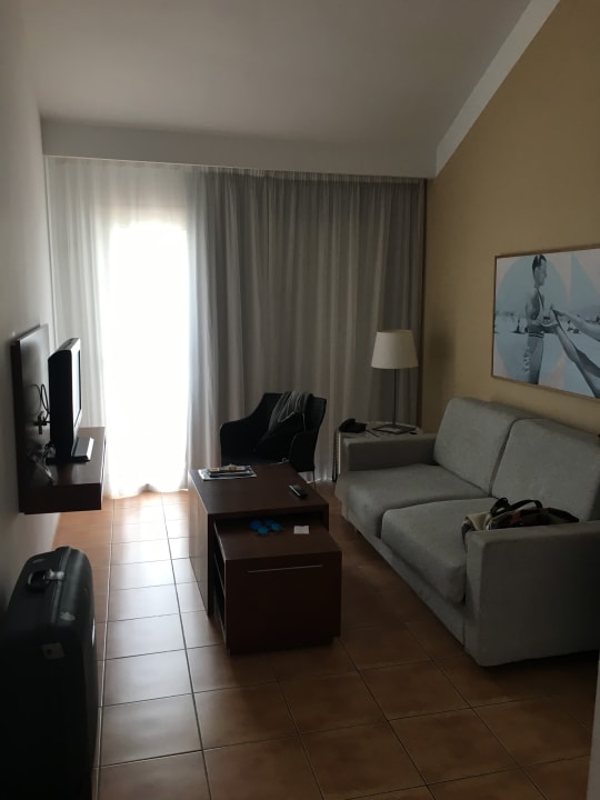 Wohnzimmer mit TV, Sitzgelegenheit und Balkontür