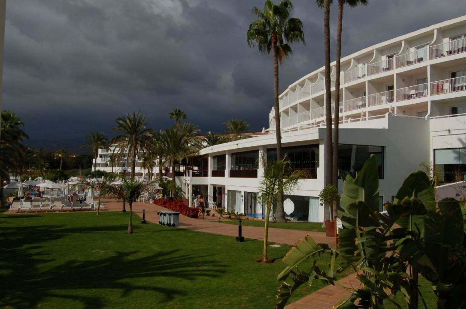 Blick vom Balkon unseres Apartments, auf 3 Pools, sowie Lobby und Hotel, mit aufziehendem Regen im Hintergrund (der ca. 30 Sekunden dauerte ;-) ).
