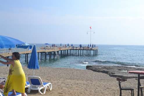 grober Sandstrand mit hoteleigenem Badesteg