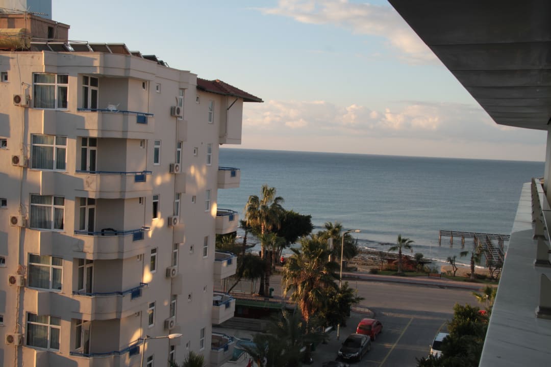 Ausblickder seitliche Meerblick, wie ihn wohl die meisten Zimmer haben, links bei den Palmen hält der Dolmus