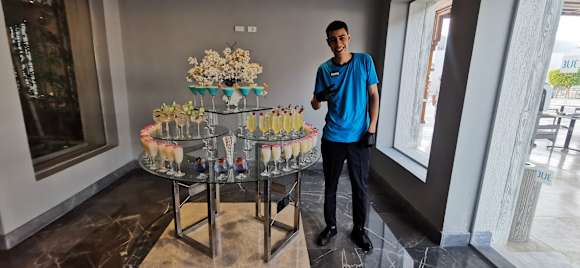Gastroein ganz lieber Kellner begrüßt die Gäste am Eingang mit einem Cocktail