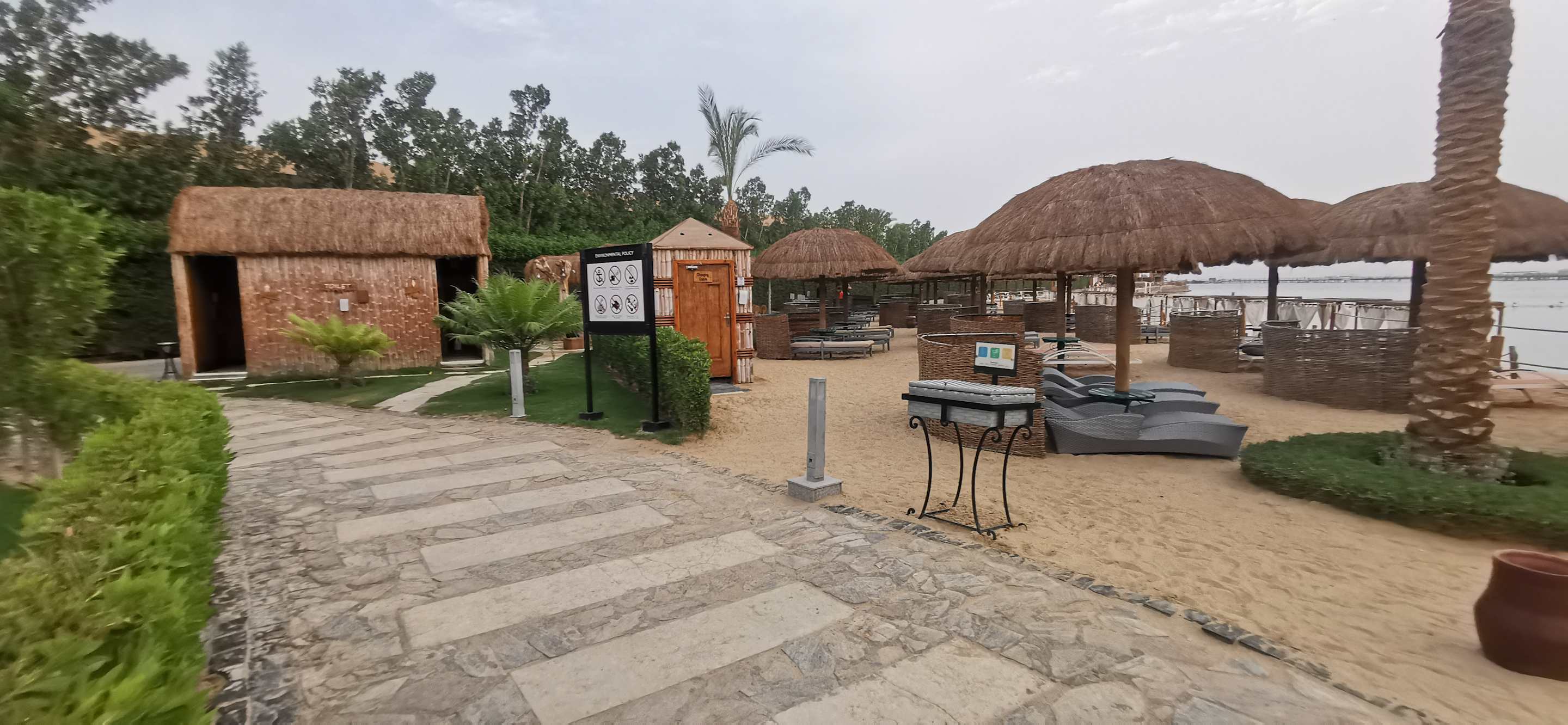 Weg vom Strand zur Strandbar mit Sitzgelegenheiten