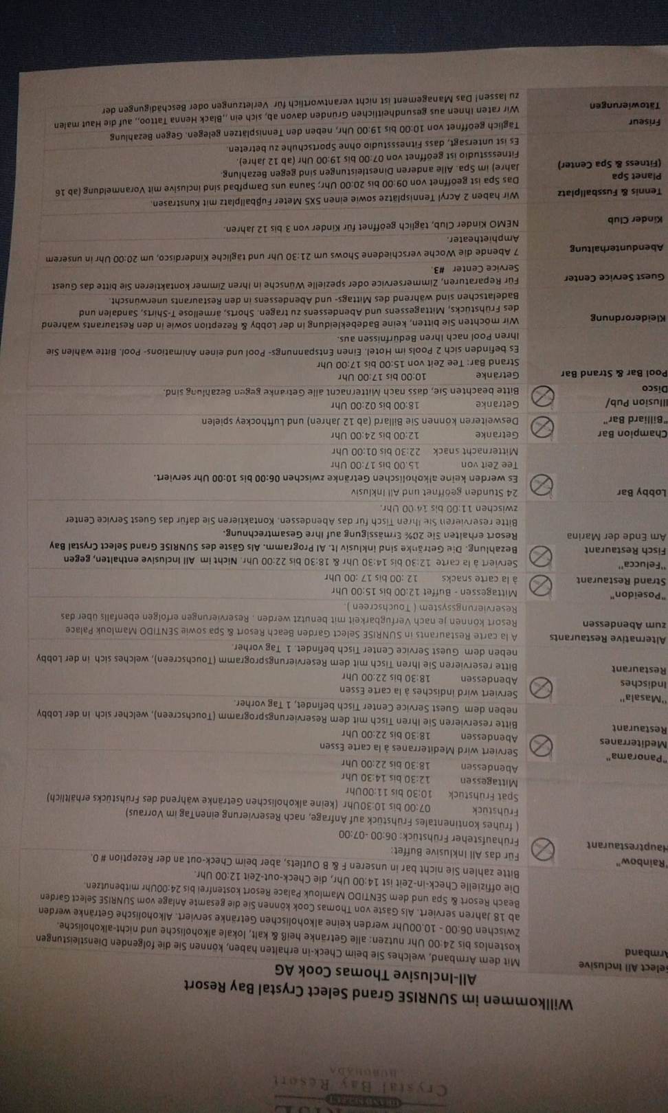 Info-Blatt des Hotels