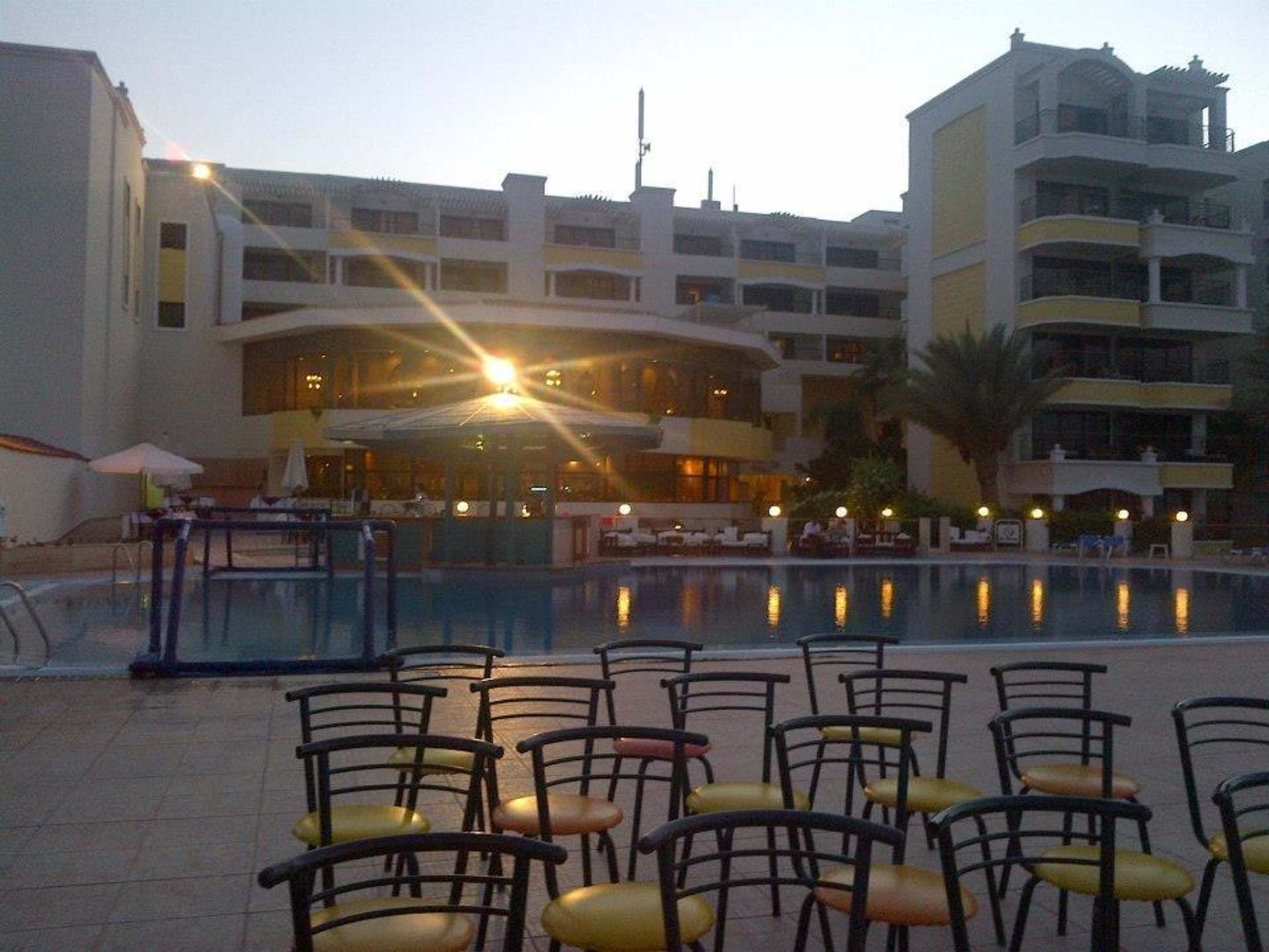 View of hotel from stage area by pool