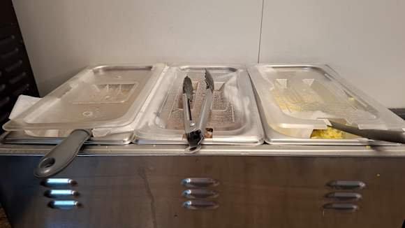 Kartoffeln links, Würstchen in der Mitte, Rührei rechts