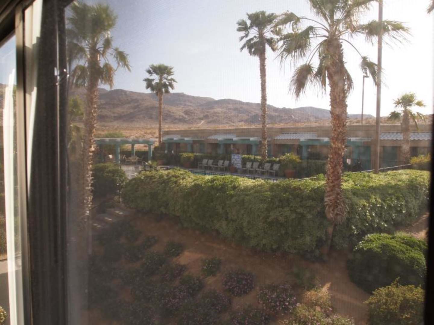 Blick vom Zimmer zum Pool/Garten