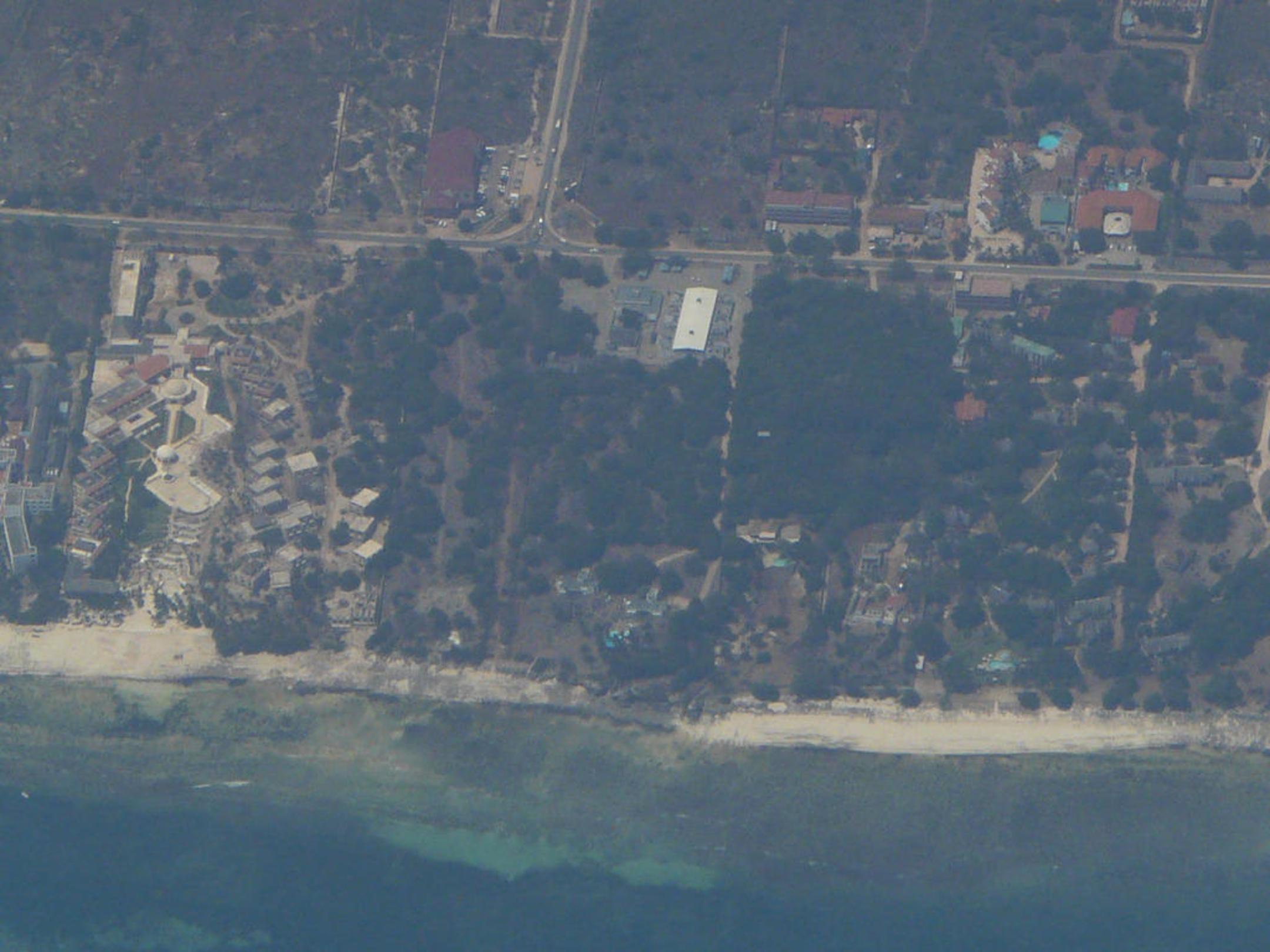 Luftbild vom Hotel während der Bauzeit. In der Mitte das Barclays Centre, links davon neben der Einmündung der Einkaufsmarkt Nakumat, rechts davon Aniello, Diani Villas und Colliers Centre.