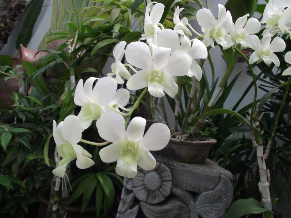 Rings um den relativ schmutzigen Pool viele Blumen