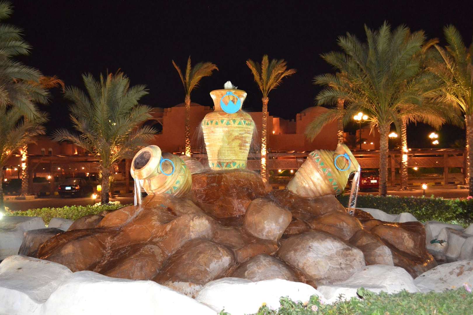 Pohled na fontánu před vchodem do hotelu Swisstouch Oriental Resort Marsa Alam