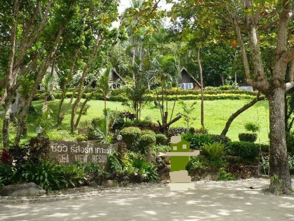 Hotelstrand, viel Grün und Bungalows
