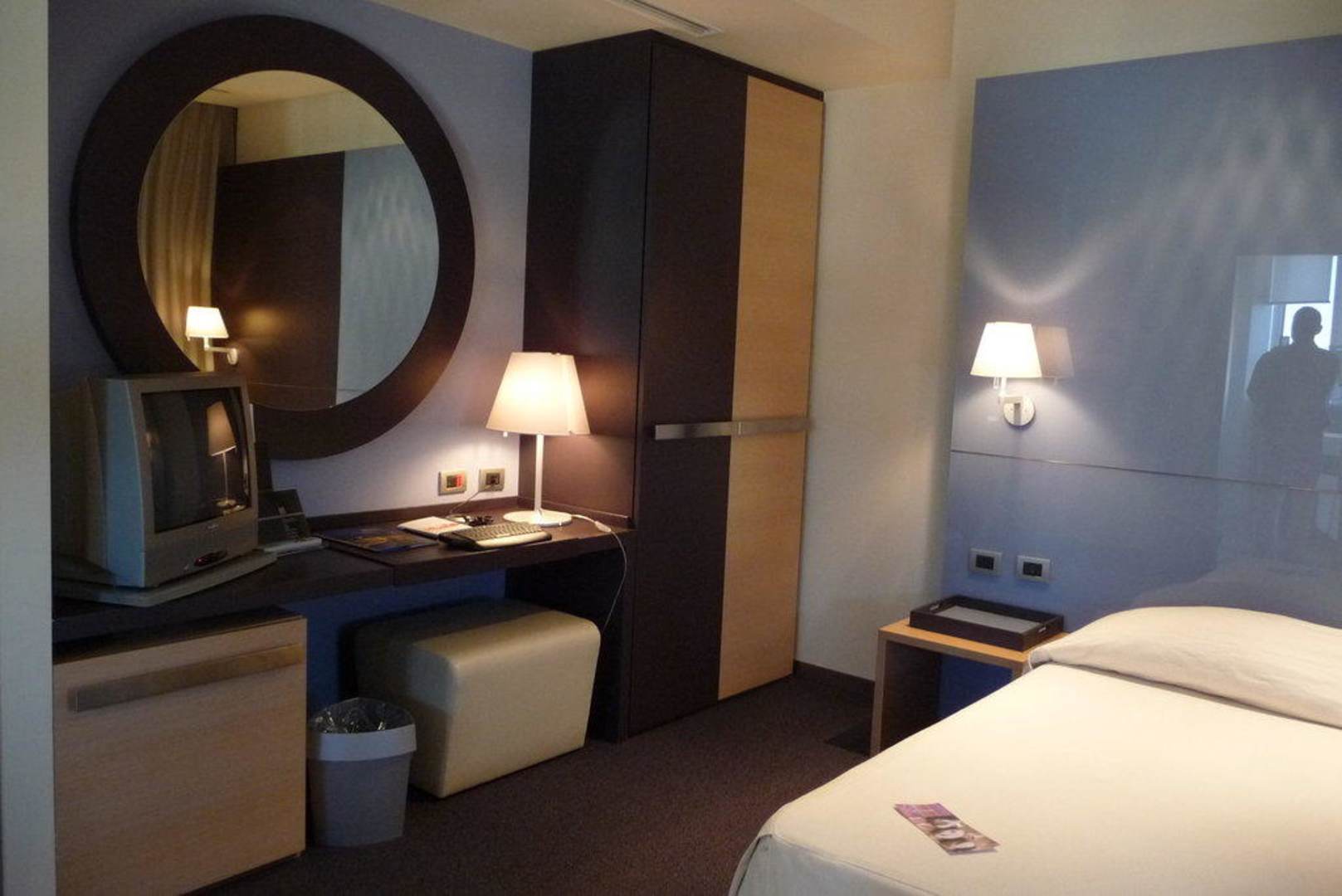 An der linken Wand neben dem Doppelbett: geräumiger Schrank mit Safe, Schreibtisch mit Lampe und Spiegel an der Wand, Hocker, Minbar. Daneben TV (auf dem Foto nicht zusehen). Alle Möbel aus edlem Holz.
