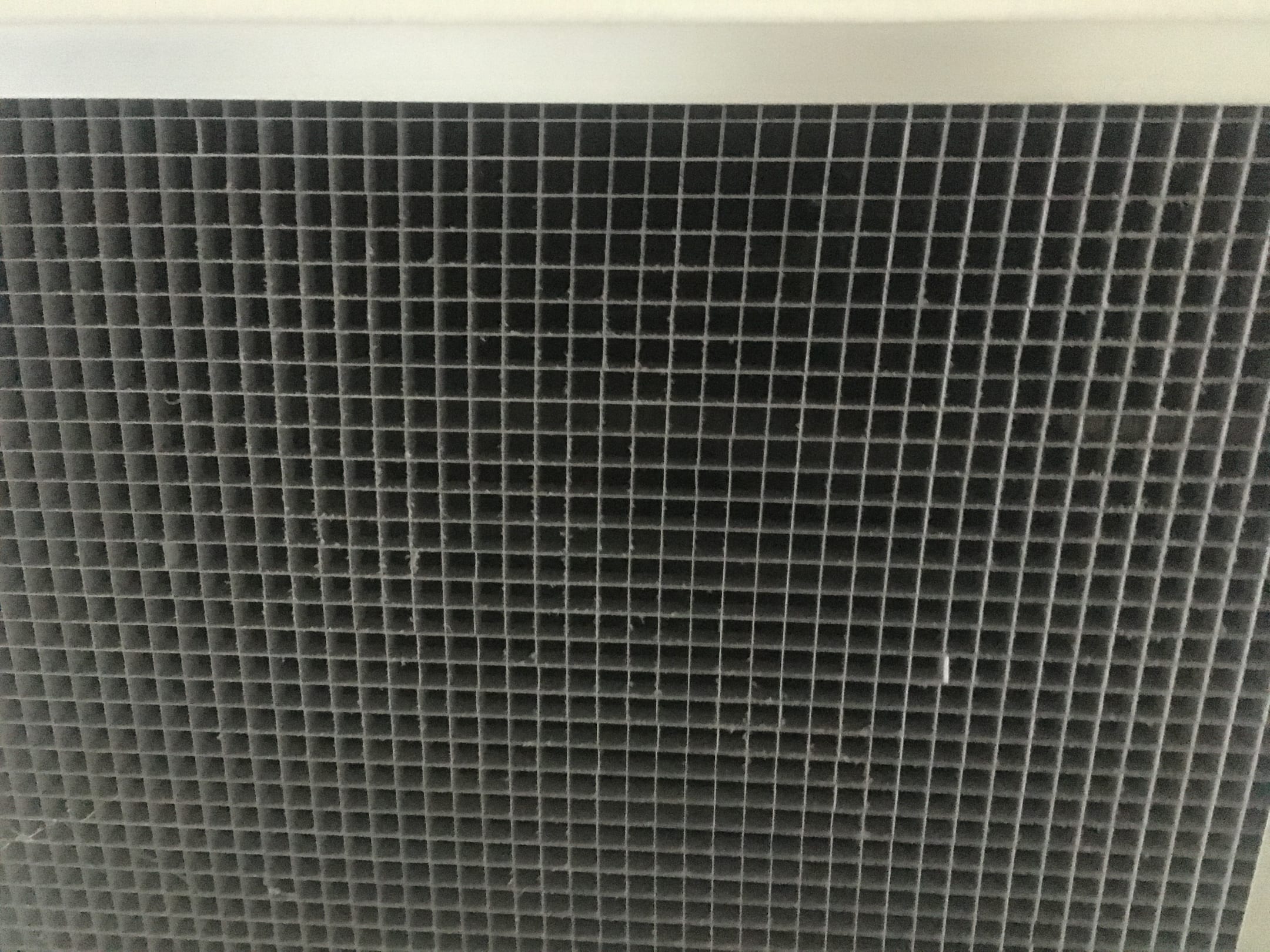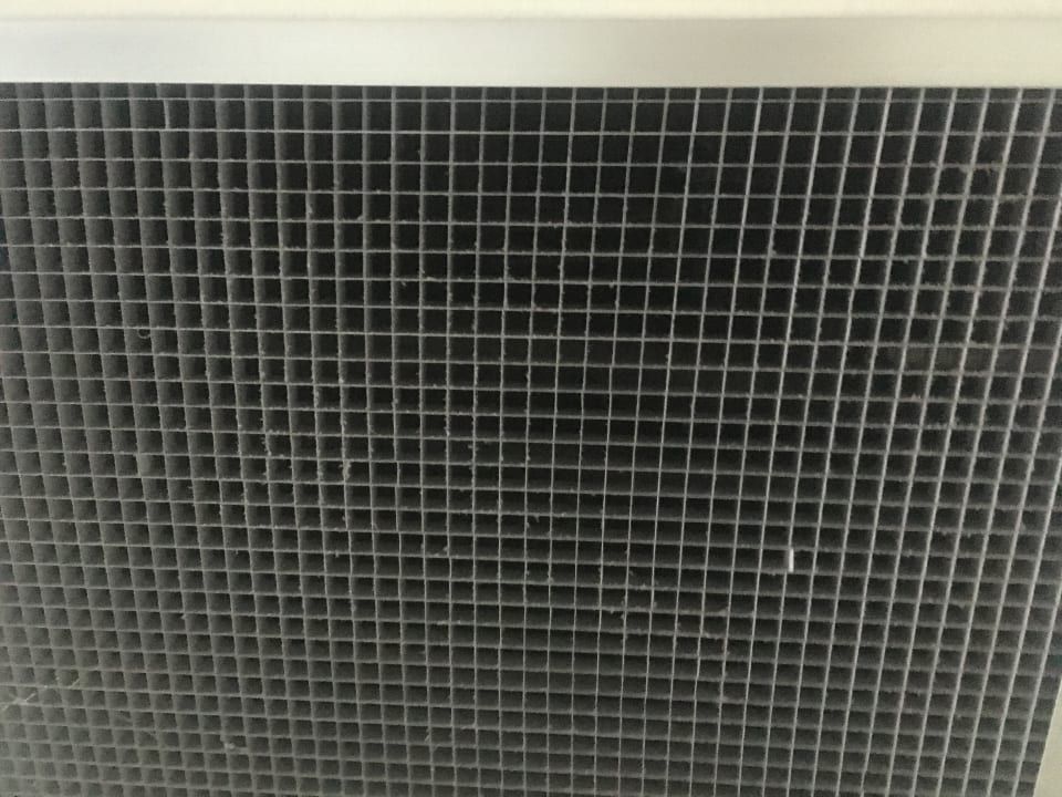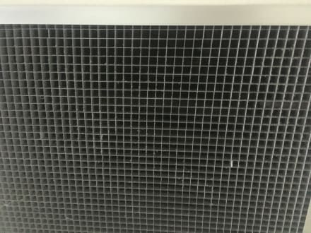 Schmutziges Lüftungsgitter. Fenster und Teppichboden ebenfalls schmutzig.