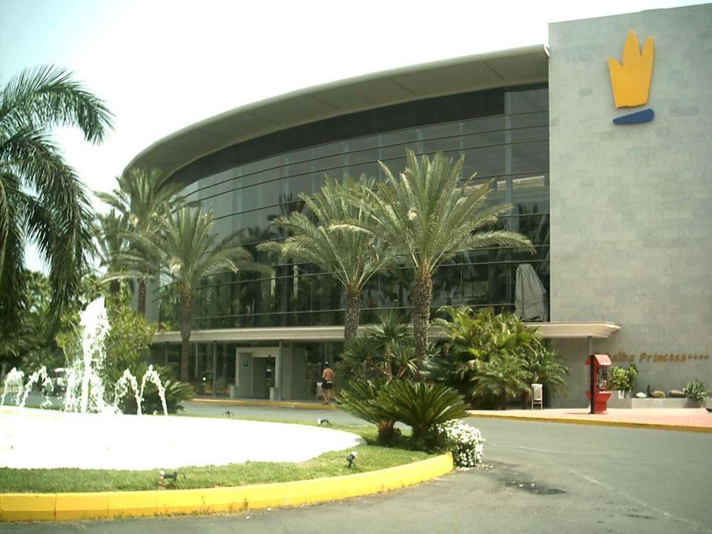 Hotel von außenEingan zum Hotel Tabaiba Princess.Daneben ein Springbrunnen.Das gesamte Hotel ist mit viele Pflanzen und Palmen bepflanzt.