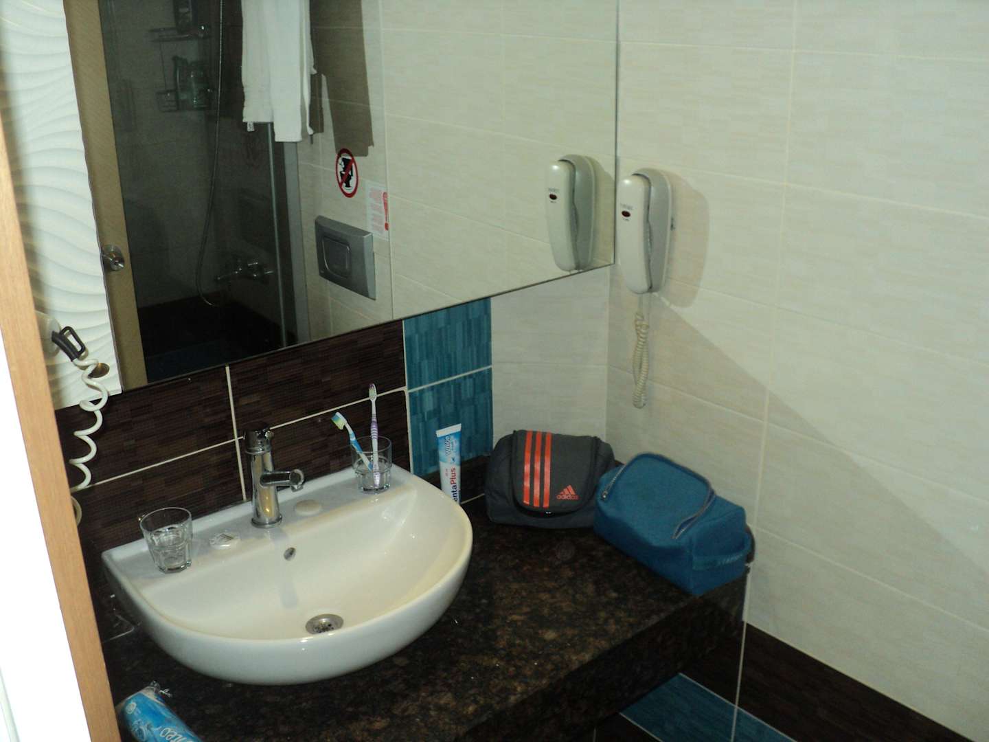 KoupelnaNalevo fén, napravo cosi jako telefon, divné, když u postelí je klasický. Asi zdvojený. Opět dostatečně velké zrcadlo.