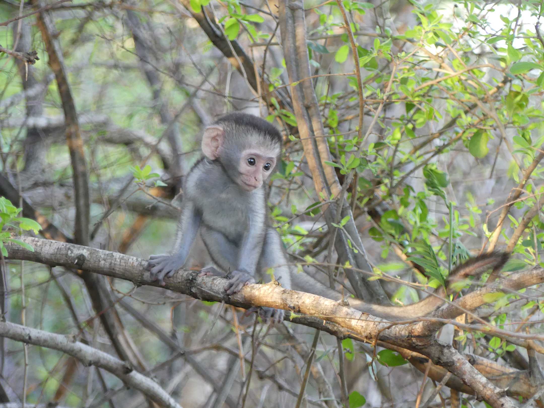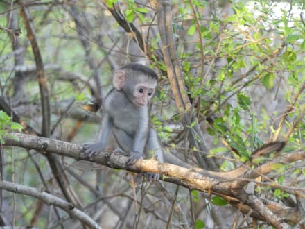 Grünmeerkatze bei den Zelten