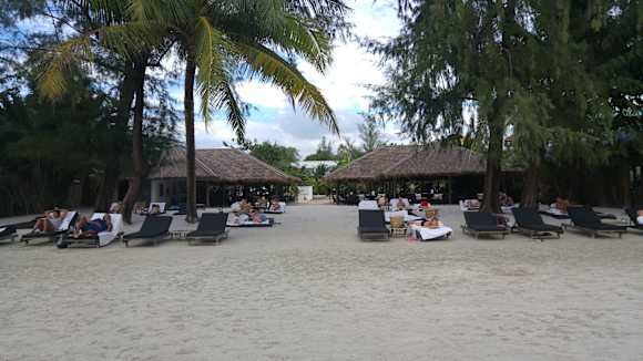 Blick vom Wasser auf Liegen/Restaurant